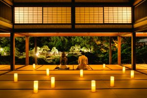 夕食後は、 大広間にて灯が灯された日本庭園を眺めながら、 ゆっくりとした時間をお過ごしいただけます。